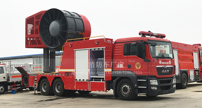 答:顧名思義就是用來排除煙霧的。此款車上裝備風機、導風管,用于火場排煙或強制通風,以便使消防隊員進入著火建筑物內進行滅火和營救工作,它的風力是非常巨大的!
