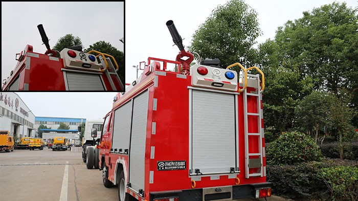 在箱體尾部上方還有兩個紅藍兩色的爆閃燈,它們的作用是讓出警時的消防車更加醒目,同時提醒行人和車輛及時避讓。箱體尾門卷閘門旁邊還有一架折疊梯子,它的作用是方便消防員到車頂取用或操作消防設備,設計很周到。這個小細節也很重要,在尾門下面可以看到兩個黃色的圓環,它們的作用是能夠讓這臺泡沫消防車在必要時牽引車輛或清理障礙。